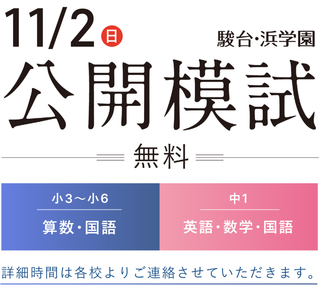 11月2日(日)、全校にて駿台・浜学園の公開模試を行います。対象は小3〜中1になります。