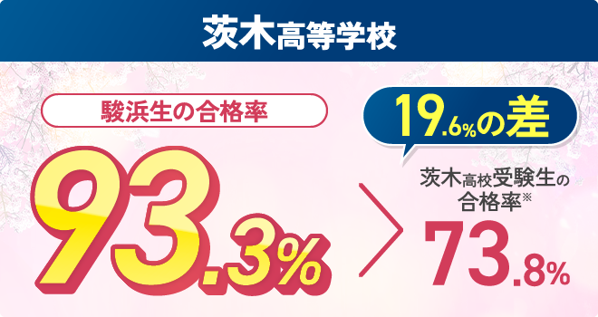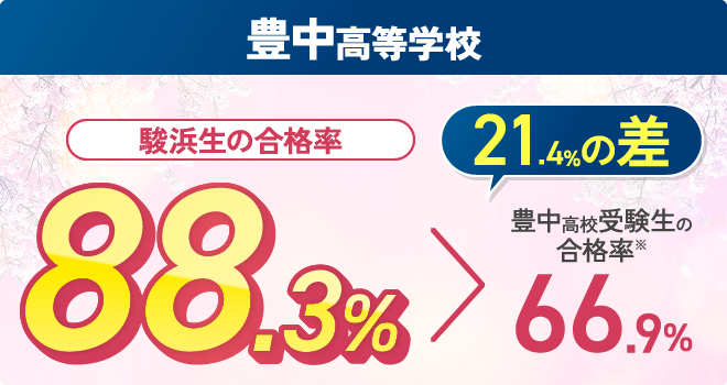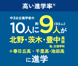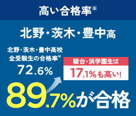 ※2025年度の実績です。※合格者は駿台・浜学園の校内生のみの結果です。季節講習のみの受講生、公開テスト生や個別指導教室など同じグループの別サービスを利用している生徒は含みません。※北野・茨木・豊中高校全受験生の合格率は、大阪府教育委員会発表の令和7年度大阪府公立高等学校、一般入学者選抜(全日制の課程)の志願者数(令和7年3月6日午後2時(締切数))より、(募集 人員)÷(志願者数)にて算出した数値(小数第2位を四捨五入)です。※進学率は、(各高校に進学した生徒数)÷(全公立高校へ 進学した生徒数)で算出しており、公立高校進学者の内、各高校への進学割合を表します。